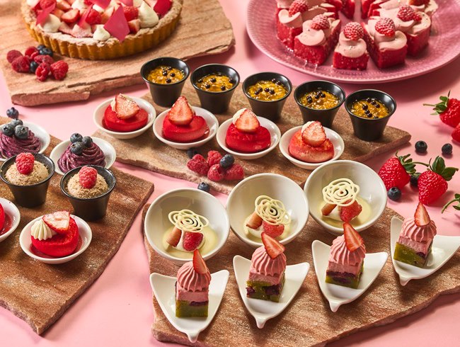 ストロベリーに加え、ラズベリー、ブルーベリー、ブラックベリーなど、多彩なベリーの魅力を贅沢に味わっていただけるアフタヌーンブッフェです。エグゼクティブ ペストリーシェフ フレデリック・モローが、芳醇な香りと瑞々しさに満ちたベリーを、ケーキ、ムース、タルト、ゼリー、クッキーなど、洗練されたスイーツへと昇華させました。セイヴォリーにも軽やかな酸味と彩りを添えるベリーを巧みに取り入れ、甘美さと爽やかさが響き合う上質なハーモニーを演出いたします。心弾むベリーの饗宴をお愉しみください。